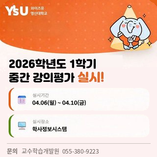 학교소개 지혜로운 가치를 배우는 대학, 지혜로운 당신을 만드는 대학 메인으로 이동 학교소개 학교소개 입학 대학/대학원 대학생활 커뮤니티 공익신고/청탁금지 및 행동강령 위반신고 열린총장실 건학이념과비전 연혁·상징 현황 캠퍼스안내 열린총장실 학교법인 법령상위원회 생명윤리위원회 영산법률문화재단 연설문 총장 인사말 이력보기 연설문 기고문·인터뷰 연구실적 동정 포토갤러리 업무추진비 사용명세 SNS 공유하기 페이스북 트위터 블로그 인쇄 홈으로 학교소개 학교소개 건학이념과비전 건학이념과 인재상 특성화전략 연혁·상징 연혁 상징 현황 기구표 학칙·규정 교류·협력 예결산·자료실 통계연보 행정감사결과공개 캠퍼스안내 캠퍼스맵 스쿨버스 오시는길 해운대캠퍼스 주차요금표 열린총장실 총장 인사말 이력보기 연설문 기고문·인터뷰 연구실적 동정 포토갤러리 업무추진비 사용명세 학교법인 이사장실 설립목적·건학정신 연혁 현황·조직도 임원 및 이사회 회의록 임원 친족관계 교직원 법령상위원회 대학평의원회 등록금심의위원회 기금운용심의회 생명윤리위원회 영산법률문화재단 재단 및 문화상 소개 출연자소개 연설문 학교소개 건학이념과비전 건학이념과 인재상 특성화전략 비전과 목표 특성화전략(이전) 연혁·상징 연혁 상징 UI 템플릿 교가·응원가 현황 기구표 학과소개 학칙·규정 학칙·규정 의견수렴 교류·협력 국제교류 산학협력 국내학술교류대학 자매고교 예결산·자료실 통계연보 행정감사결과공개 캠퍼스안내 캠퍼스맵 해운대캠퍼스 양산캠퍼스 스쿨버스 해운대캠퍼스 부산방면 울산방면 창원·장유·김해방면 해운대캠퍼스-양산캠퍼스순환 양산캠퍼스 부산방면 울산방면 창원김해양산방면 양산캠퍼스-서창순환 양산캠퍼스-해운대캠퍼스순환 오시는길 해운대캠퍼스 양산캠퍼스 해운대캠퍼스 주차요금표 열린총장실 총장 인사말 이력보기 연설문 기고문·인터뷰 연구실적 동정 포토갤러리 업무추진비 사용명세 학교법인 이사장실 인사말 이력보기 동정 언론보도 포토갤러리 설립목적·건학정신 연혁 현황·조직도 임원 및 이사회 회의록 임원 친족관계 교직원 법령상위원회 대학평의원회 목적 및 설립근거 평의원 현황 대학평의원회 규정 대학평의원회 회의록 등록금심의위원회 기금운용심의회 생명윤리위원회 IRB소개 IRB 심의 안내 자료실 공지사항 영산법률문화재단 재단 및 문화상 소개 출연자소개 입학 대학 대학원 International Application 한국어교육센터 평생교육원 원격평생교육원 평생교육원(양산캠퍼스) 평생교육원(해운대캠퍼스) 교육연수원 인사말 프로그램 법과인문학아카데미최고위과정 양산인문학과정 디지털 혁신·미래비전 최고위과정 대학/대학원 대학 학과소개 대학원 일반대학원 부동산대학원 사회과학대학원 한국문화대학원 관광·경영대학원 미용예술대학원 스포츠산업대학원 명예박사 수여자 대학생활 학사 수업 수강편람 수강신청·재수강·계절학기 개설교과목 · 강의시간표 조회 수강신청방법 수강신청 희망과목 담기 수강편람 교직과정 성적평가·조회·정정 강의평가 유고결석 스마트전자출결 강의계획서 조회 학사일정 등록금안내 등록금안내 등록금 납부 안내 등록금 분할 납부 안내 수업연한초과자(9학기 이상 등록자) 0원 납부자 등록 안내 학적 다전공·전과 휴학·복학 자퇴·제적·재입학 졸업·조기졸업·이수학점 졸업인증제 와이즈 핵심역량 인증제 학사 서식·자료실 증명서 발급 증명서 발급방법 증명서 종류 증명서 발급 대상자 국제학생증 발급 장학·학자금 장학 대학생 신입생 정부장학·학자금 국제교류 프로그램 안내 후기 취업·진로개발(YCMP) 학습지원 영어교육 자기주도학습·비전·리더십 독서·글쓰기 클리닉 도서관 공직시험 지원 로스쿨 진학 지원 학생활동.병무.편의 학생회.동아리.언론사 양산캠퍼스 해운대캠퍼스 병무.예비군 병무 예비군 편의.복지.기숙사 교내식당 주간메뉴 온라인 서비스 천원의 아침밥 시설사용안내·신청 풋살경기장 잔디운동장 창의설계실 신청하기 예약현황 학부모 참여 학부모 참여 소개 학교생활 안내 내 자녀 정보 학부모와 함께하는 교육 학년별 학습 및 대학생활 지도 학년별 진로지도 학부모 참여 프로그램 커뮤니티 공지사항 와이즈유 이야기 보도자료 뉴스&행사 언론속와이즈유 자랑스런 와이즈유 대학광고 입시홍보영상 이미지 생활정보·Q&A 학사 Q&A 영산사랑게시판 학사운영건의함 영산마켓 분실 · 습득물 분실물 습득물 숙박 카풀 대학발전기금 대학뉴스레터 기타 왜 와이즈유를 주목하는가 대학자체평가 행정정보공개 정보공개제도안내 정보공개접수처 및 관련서식 사전정보공개 정보목록 관계법령 개인정보처리방침 개인정보처리방침 개인정보처리방침 이전자료 개인정보제공내역공지 영상정보처리기기 운영 및 관리방침 영리목적의 광고성정보전송거부 부정청탁&금품수수 신고 및 문의 공지사항 서식자료실 권익위사례해설 관계법령 질의응답게시판 동영상자료실 위반사례신고 국민권익위원회 공무수행사인 현황 이메일무단수집거부 사이트맵 통합검색 홈페